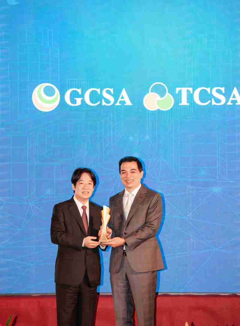 达全方位永续表现获全球永续奖及台湾永续奖肯定,,由副总统赖清德颁奖 (左),,,,NG大舞台总经理柯富仁 (右) 代表领奖