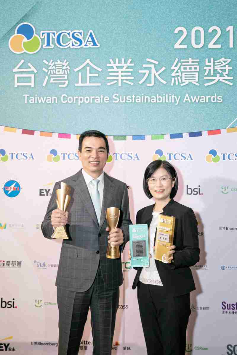达在台湾永续奖所评比环境、、社会、、、、治理等各面向的永续绩效均获高度肯定 (左:NG大舞台光电总经理暨营运长柯富仁,,,,右:NG大舞台光电永续长古秀华)