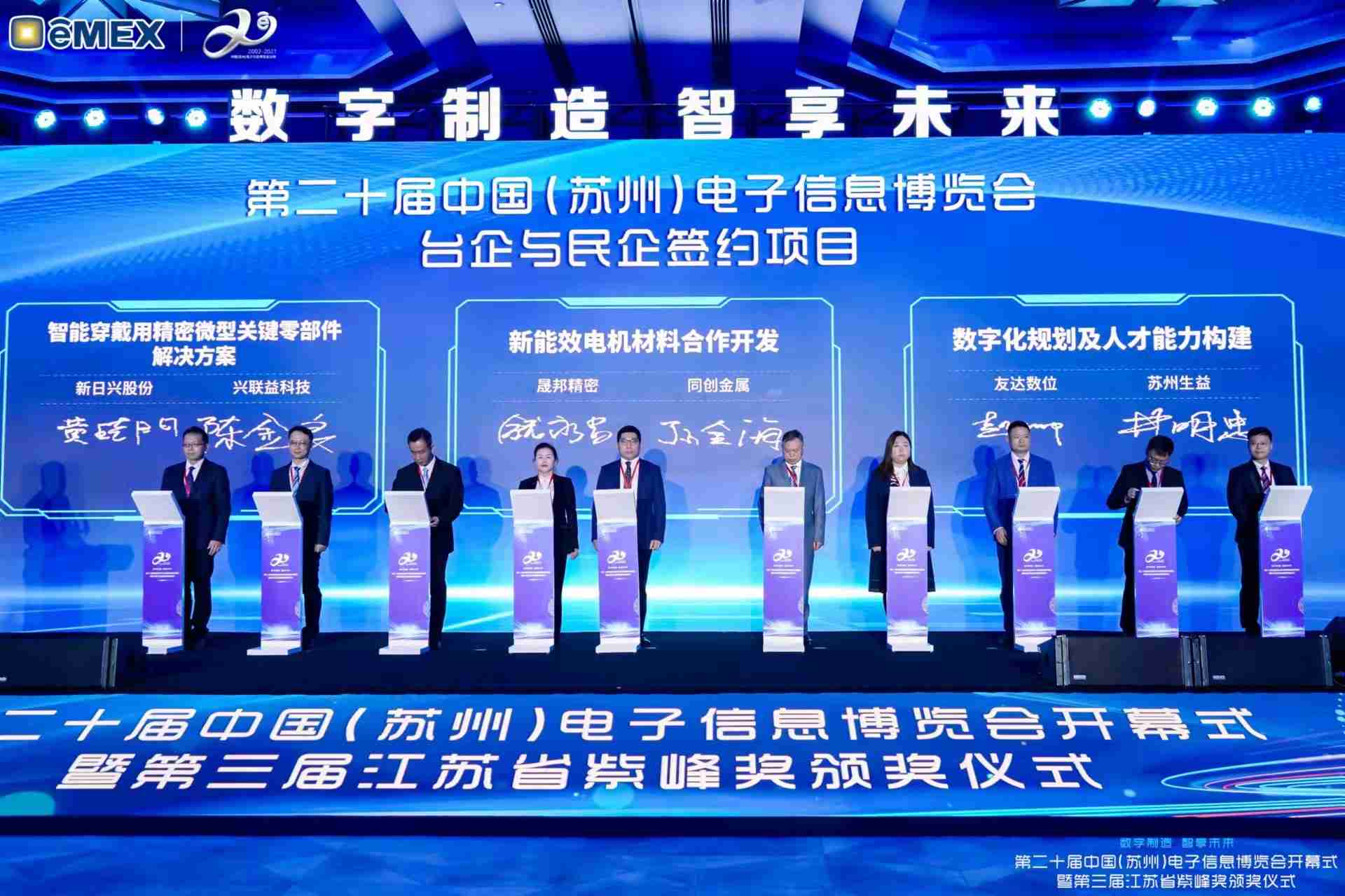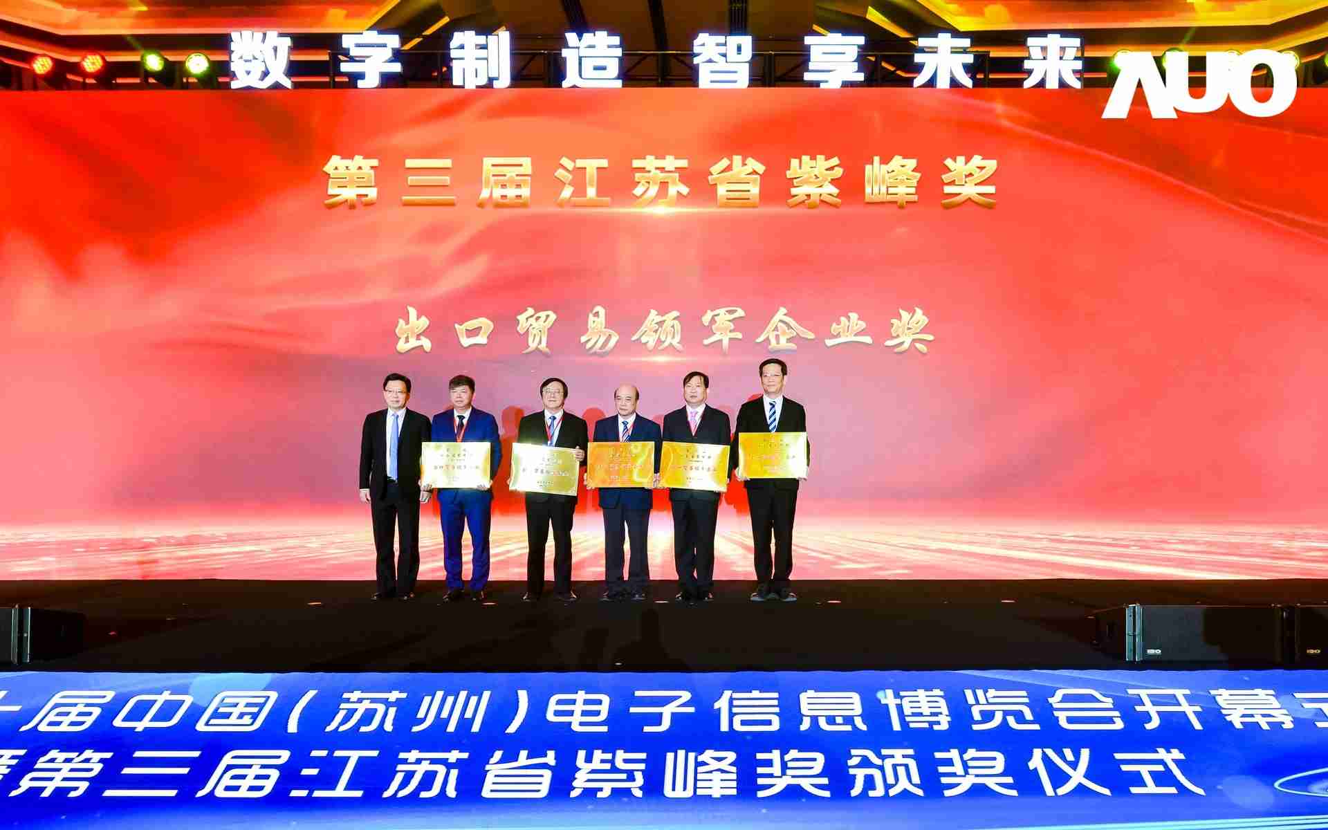 电博会开幕式当天也是第三届江苏省紫峰奖颁奖仪式,,省台办、、、、工信厅、、、、商务厅、、、苏州市相关领导均出席并颁奖。。该奖项为表彰对江苏高质量发展做出积极贡献的在苏企业,,,,由江苏省政府专门设立。。。NG大舞台光电 (苏州) 总经理郭振明代表上台领奖,,,这也是NG大舞台苏州连续三次蝉联紫峰奖 出口贸易领军企业奖。。。。NG大舞台数位总经理赵丽娜女士,,也参与本次开幕式,,,上台为本地化赋能签署战略合作协议,,,将优质服务资源集合、、、、下沉到更多细分行业,,,,为更多地区的制造企业提供数字化转型服务。。。。