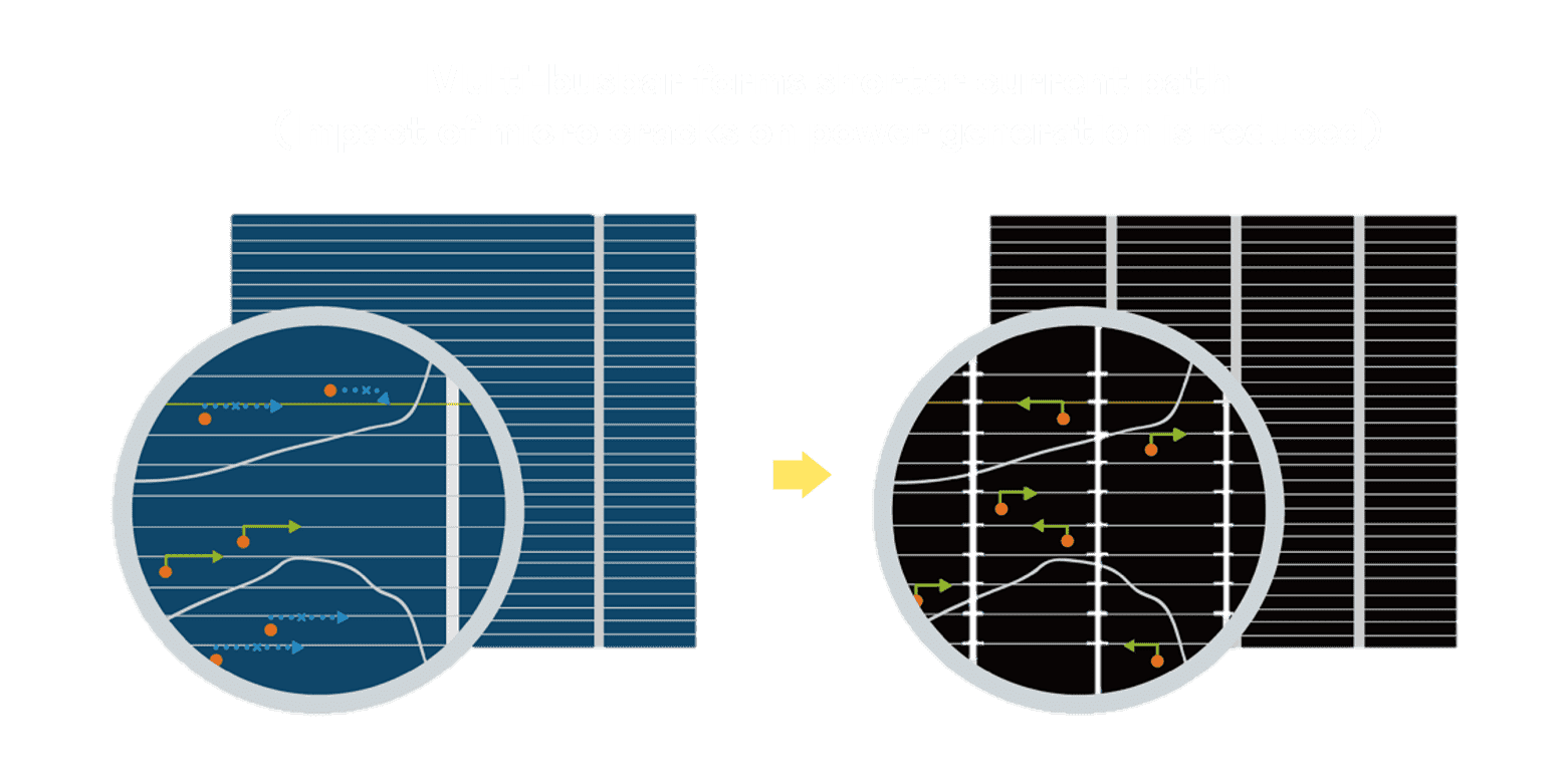 - 电池使用多条铜导线 (Copper wire) 于电池片上形成较短的电流路径,,,提高电流收集效率,,,,采用圆形设计的铜导线较传统扁平式的铜焊带 (Ribbon),,可增加入射至电池的光线量。。